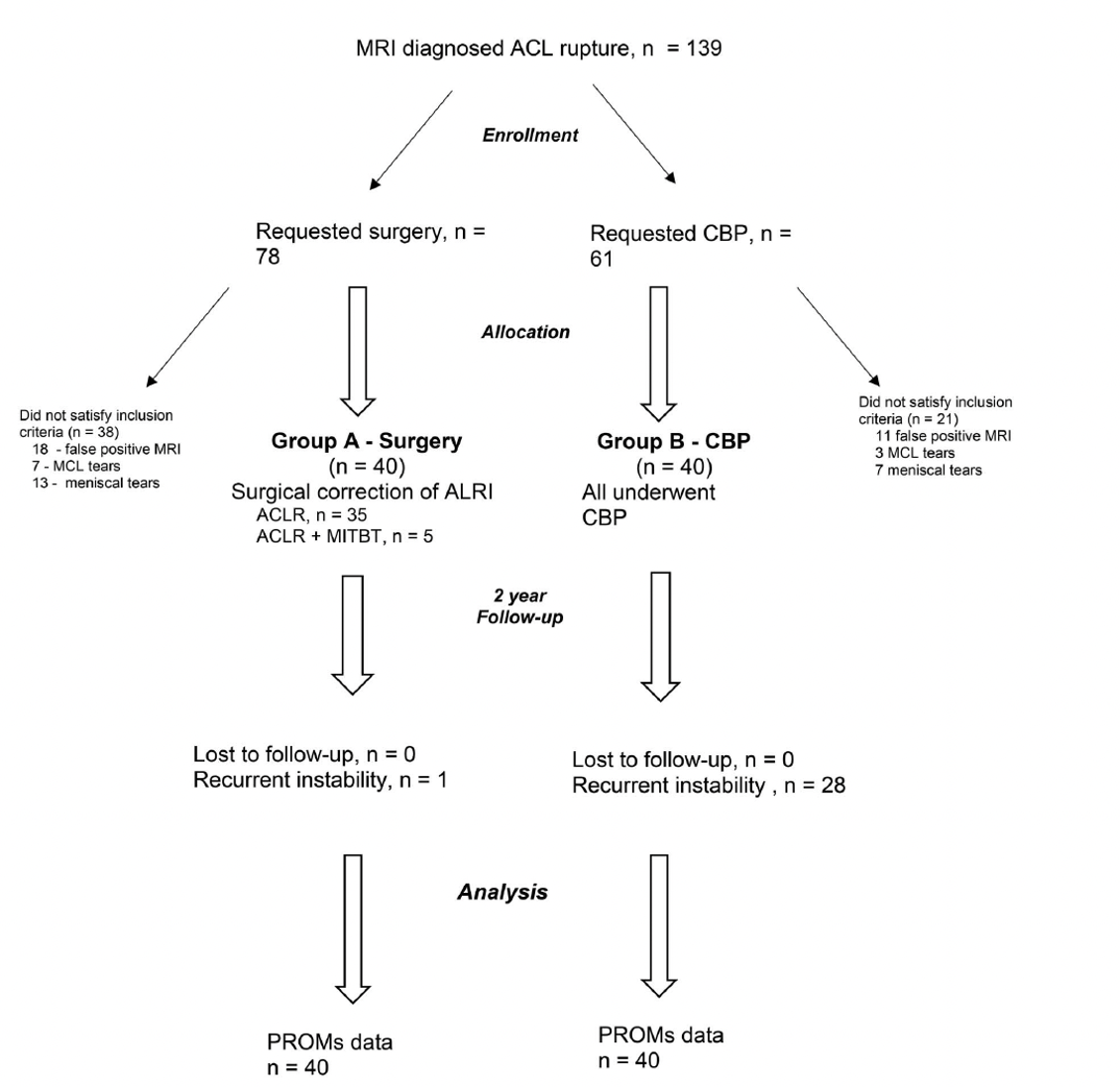 However, a recently published paper reports on prospective, matched cohort of 80 patients with an ACL rupture, involved in pivoting sports. Half were treated surgically, the other half with the CBP. After two years, the surgical group had a 1% rate of further instability, but the CBP group had a 70% rate. Rates of medial meniscal injuries were also much higher in the CBP group (62% vs 2.5%).